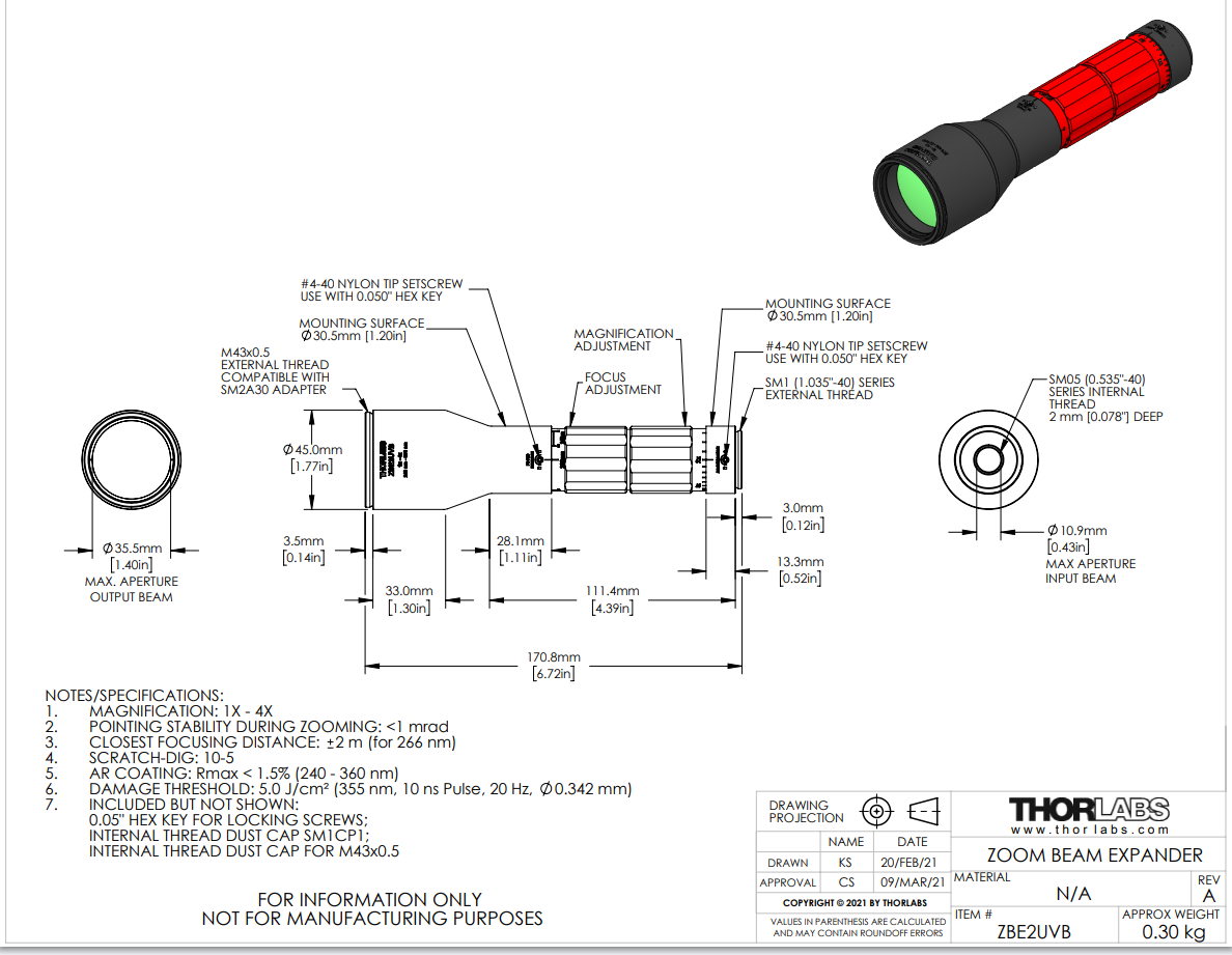 | ZBE1UVB | 0.5X - 2.5X | 10.9 mm @ 0.5X 8.0 mm @ 2.5X | 10.0 mm @ 0.5X 7.0 mm @ 2.5X | Internal: SM05 External: SM1 | SM1 | Rmax< 1.5% (240 - 360 nm) | >89% @ 248 nm >92% @ 266 nm >90% @ 355 nm | 5.0 J/cm² (355 nm, 10 ns Pulse, 20 Hz, Ø0.342 mm) |