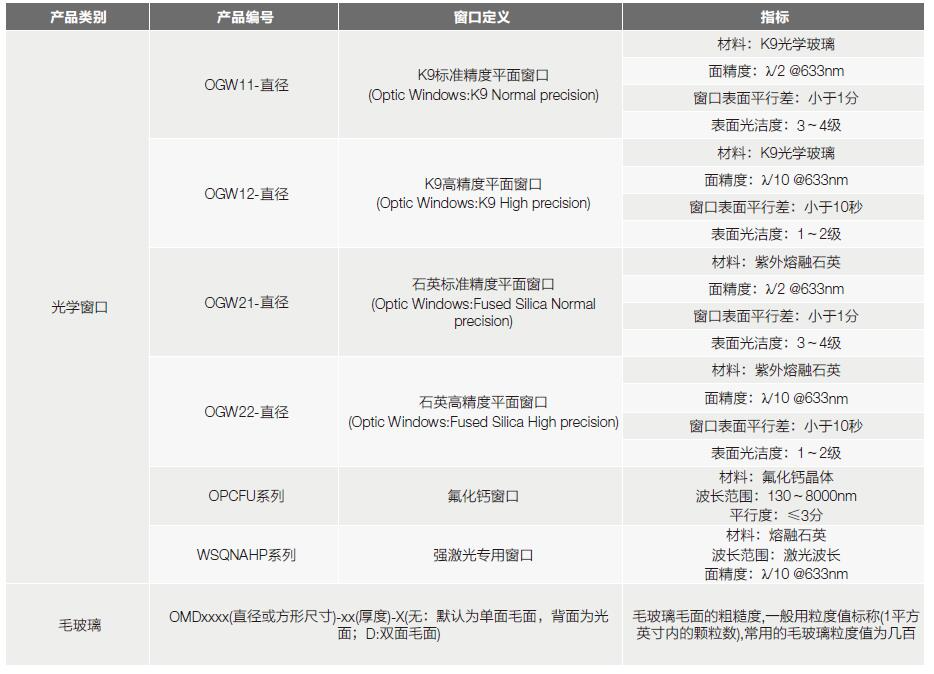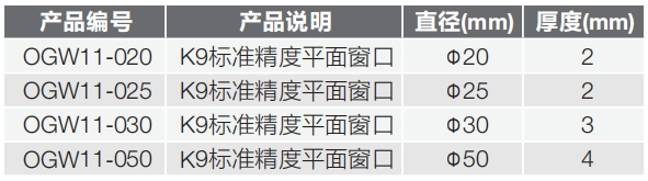 A. OGW11系列,K9玻璃,标准精度,平面窗口