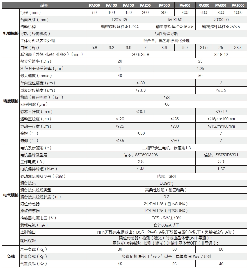 • 采用线性滑块导轨,负载能力强,运动精度高