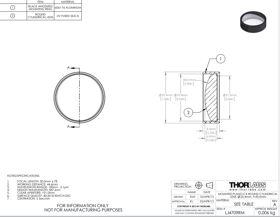 Thorlabs索雷博 LJ4709RM 平凸圆形柱面透镜