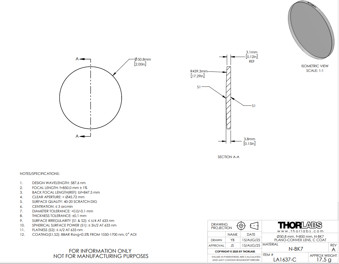 - LA1907-C、LA1541-C、LA1832-C、LA1419-C和LA1237-C透镜的设计波长为632.8纳米。