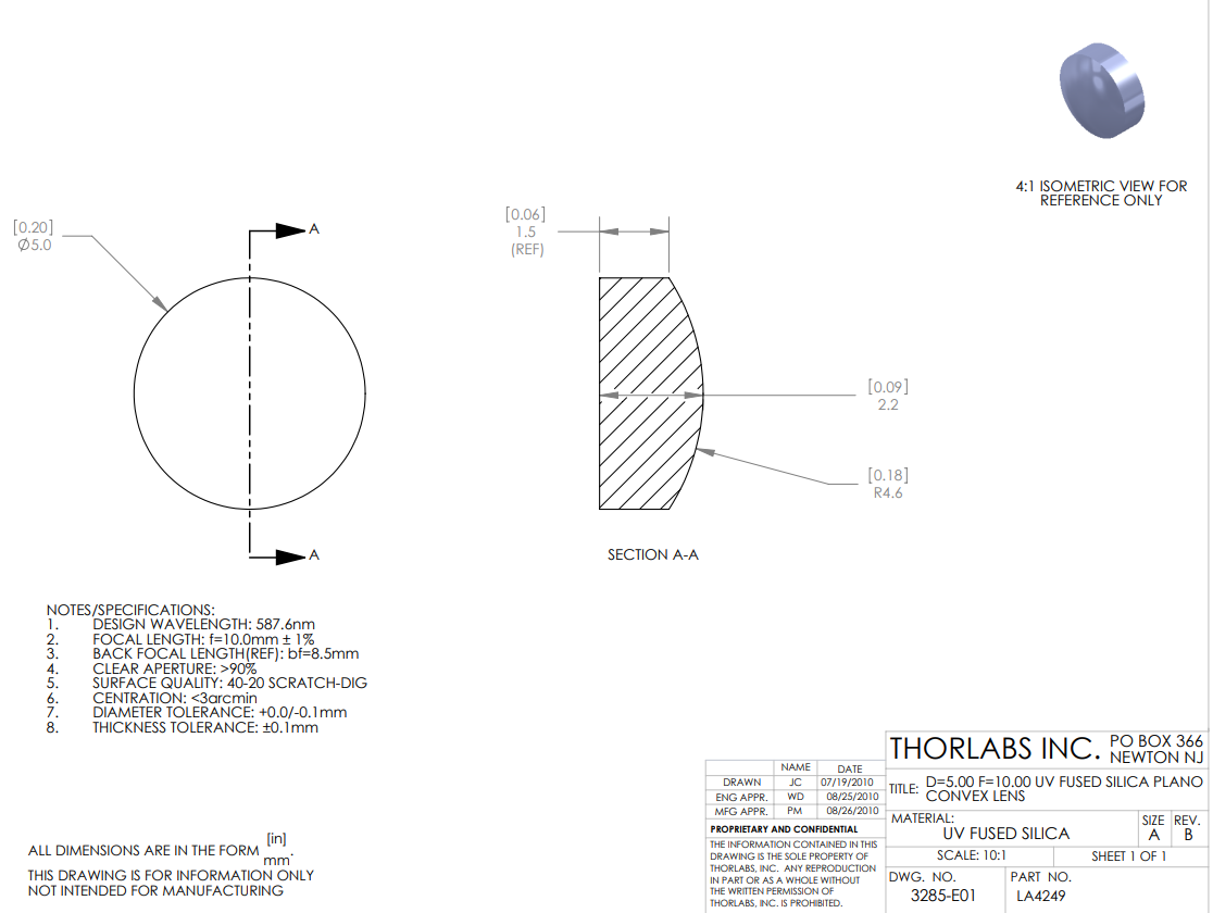 Thorlabs索雷博 LA4249 平凸透镜
