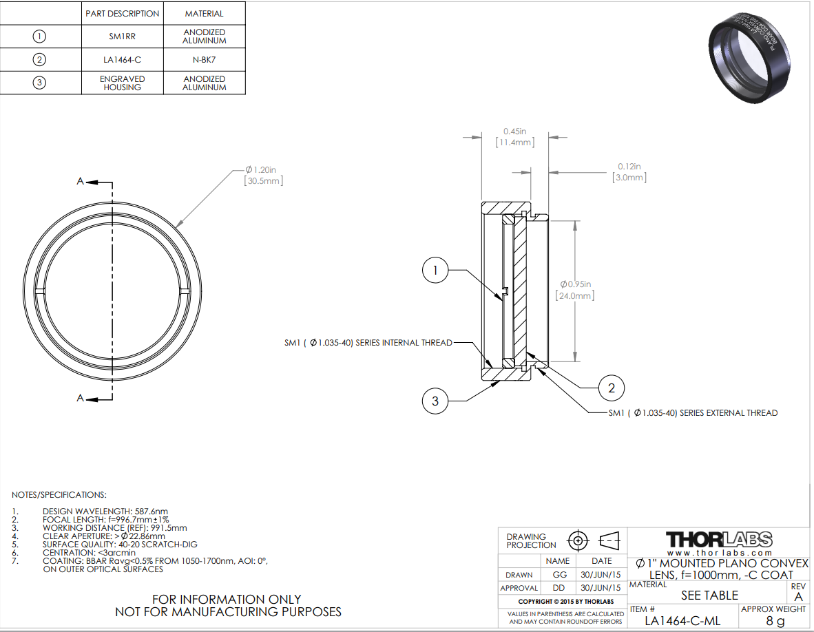 这些平凸透镜由N-BK7材料制造,它是符合RoHS标准的BK7玻璃,并且镀有增透膜,在1050 - 1620 nm或1050 - 1700 nm波长范围上提供每个表面< 0.5%的平均反射率。N-BK7是制造高性能光学元件最广泛使用的光学玻璃之一。当紫外熔融石英的额外好处(即良好的紫外透过率和较低的热膨胀系数)不那么必要时,通常会选择该材料。这些Ø1/2英寸、Ø1英寸、Ø1.5英寸和Ø2英寸的透镜分别安装在兼容SM05-(0.535"-40)、SM1-(1.035"-40)、SM1.5(1.535"-40)和SM2-(2.035"-40)螺纹的安装座上,从而兼容我们的SM螺纹透镜套管。每个透镜套筒都刻有型号,透镜类型,焦距和指向透镜弯曲表面的箭头,以及增透膜范围。