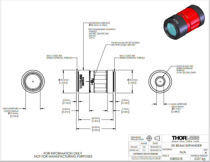 - SM2A30螺纹转接件可用于将这些扩束器与我们的SM2螺纹透镜套管和60 mm笼式组件集成。