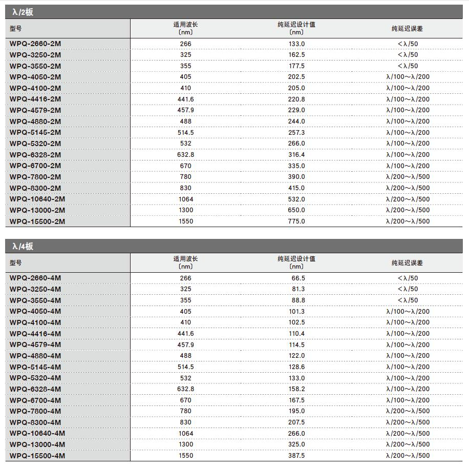 水晶波长板选型表(SIGMA KOKI):