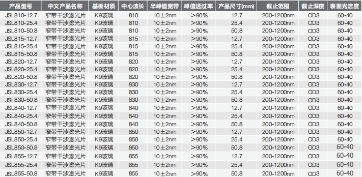 JSL系列窄带干涉滤光片(Narrow Bandpass Interference Filters):