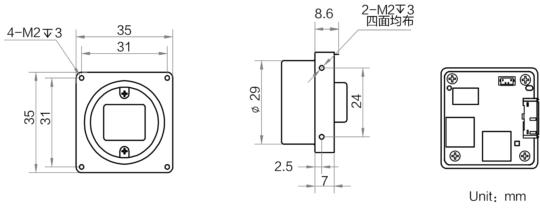 外形尺寸 | 35 mm × 35 mm × 8.6 mm(不含镜头接口) |
