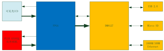 可见光数据在FPGA中做ISP处理后,与红外温度信息一起传输到DM8127中,DM8127为双核结构,内含Cortex A8和C674x DSP,另含协合处理器用于视频压缩,可以实现可见光与红外图像分别H.264编码,可见光红外图像融合,融合数据H.264编码,红外温度数据原始信息传输等功能。另外板载SD卡实现了断网保存,在没有网络的情况下实现信息存储。十分方便用户实时查看,分析等工作。
