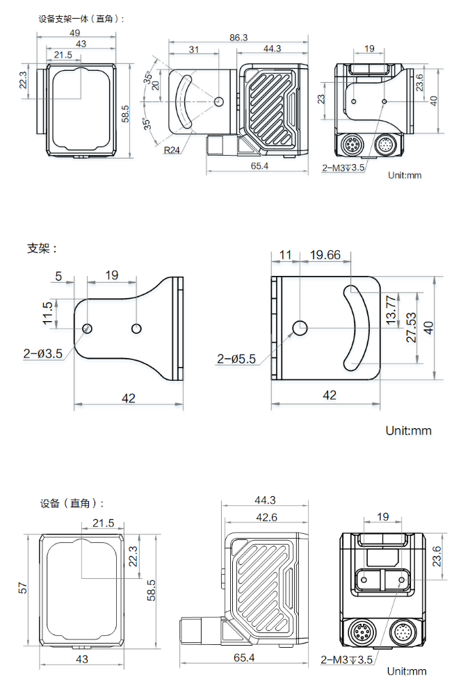 外形尺寸 | 平角:80.1 mm × 43 mm × 44.3 mm 直角:58.5 mm × 43 mm × 65.4 mm |