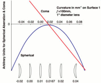 右图为彗差和球差与N-BK7透镜前表面的曲率(c)的函数关系图,N-BK7透镜的焦距是100毫米,光阑设置于透镜前表面,±20视场数。曲率(c)与更常见的曲率半径(r)的关系是c = 1/r。球差最小值位置几乎与零彗差位置相同。最小球差时的透镜外形是“最佳外形”设计的基础。