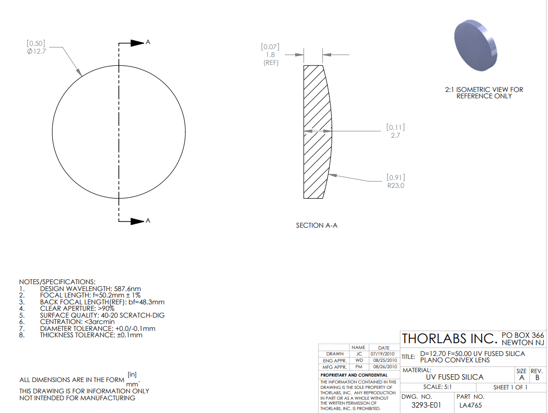 Thorlabs索雷博 LA4765 平凸透镜