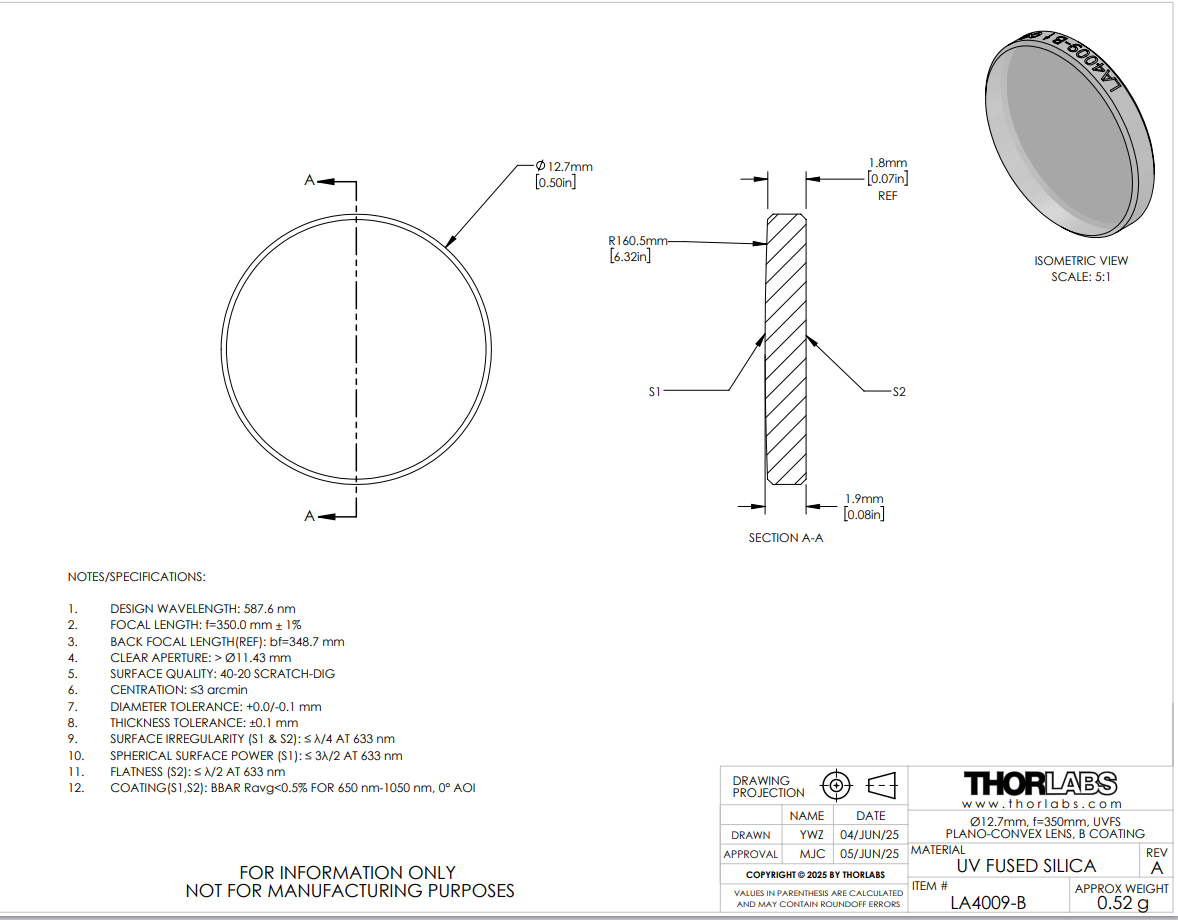 Thorlabs索雷博 LA4009-B 紫外熔融石英平凸球透镜