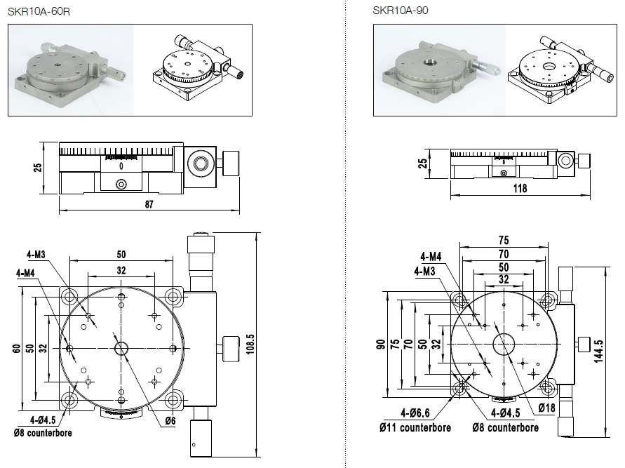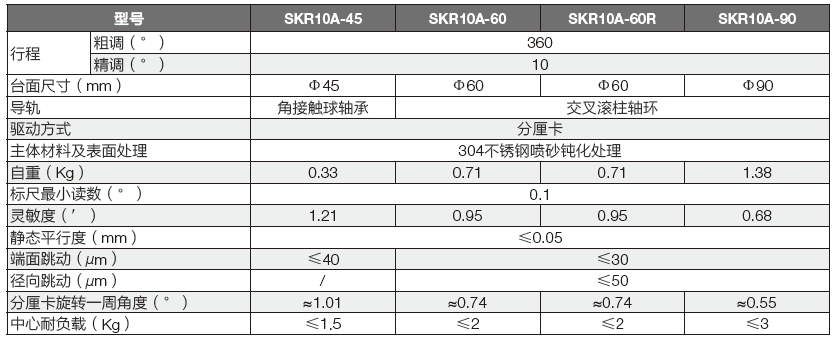SKR系列不锈钢精密手动旋转台具有大角度粗调和小角度精密调整两种功能。采用分厘卡驱动,灵敏度高。交叉滚柱轴环或角接触球轴承保证了台面在旋转时,有很好的运动特性,运动平行度等关键指标可达到国际同类产品水平。尺寸较多,可以根据需要灵活选择,SKR 系列产品适合用于手动角度调整有较高要求的领域。台面多种标准孔位的安装孔适合不同需要,下方标准固定孔方便将其与其他滑台连接,组成多维移动台。特点: