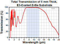 下方所有透镜均为E3 AR膜,上图用于比较厚为5 mm的未镀膜硒化锌基底的性能。透过率为垂直入射下所测。