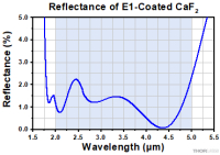 上图给出了镀E1膜的氟化钙基底的测量反射率和波长之间的函数关系图。2 - 5 μm范围内的平均反射率小于1.25%。蓝色阴影区域表示增透膜优化的波段。此区域外的性能不能保证且差异较大。上面的excel文档提供了延伸波长范围的镀膜曲线数据。