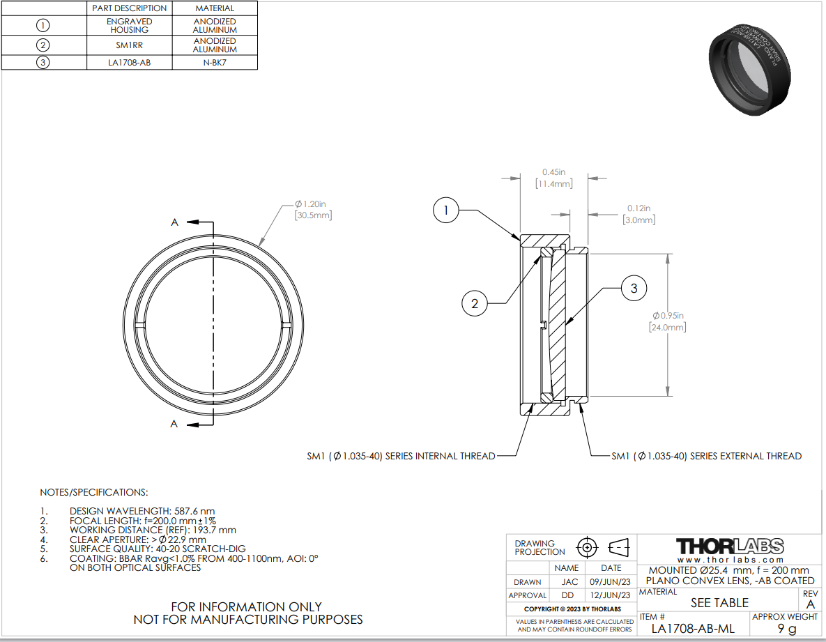 这些平凸透镜由符合RoHS标准的N-BK7材料制成,且镀有增透(AR)膜,在400 nm - 1100 nm波长范围内提供每个表面< 1.0%的平均反射率。N-BK7通常用于不需要紫外熔融石英的高级性能(如在紫外波段的高透过率和较低的热膨胀系数)的应用场合。这些Ø1/2英寸、Ø1英寸、Ø1.5英寸和Ø2英寸的透镜分别安装在兼容SM05(0.535"-40)、SM1(1.035"-40)、SM1.5 (1.535"-40)和SM2(2.035"-40)螺纹的安装座中,从而兼容我们的SM螺纹透镜套筒。SM螺纹卡环用于将透镜固定在安装座中。每个安装座都刻有产品型号、透镜类型、焦距、指向透镜曲面的箭头以及增透膜范围。