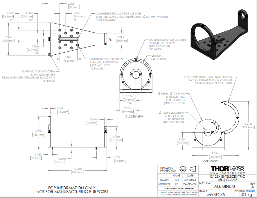 请注意,由于MVBT2313的尺寸和重量,用户必须小心且正确地安装和支撑此透镜;不应仅通过其C-Mount螺纹安装。下面销售用于安装MVBT2313和MVBT2324透镜的夹具。这些夹具具有沉头孔槽和沉头孔,可用于实现多种安装配置。