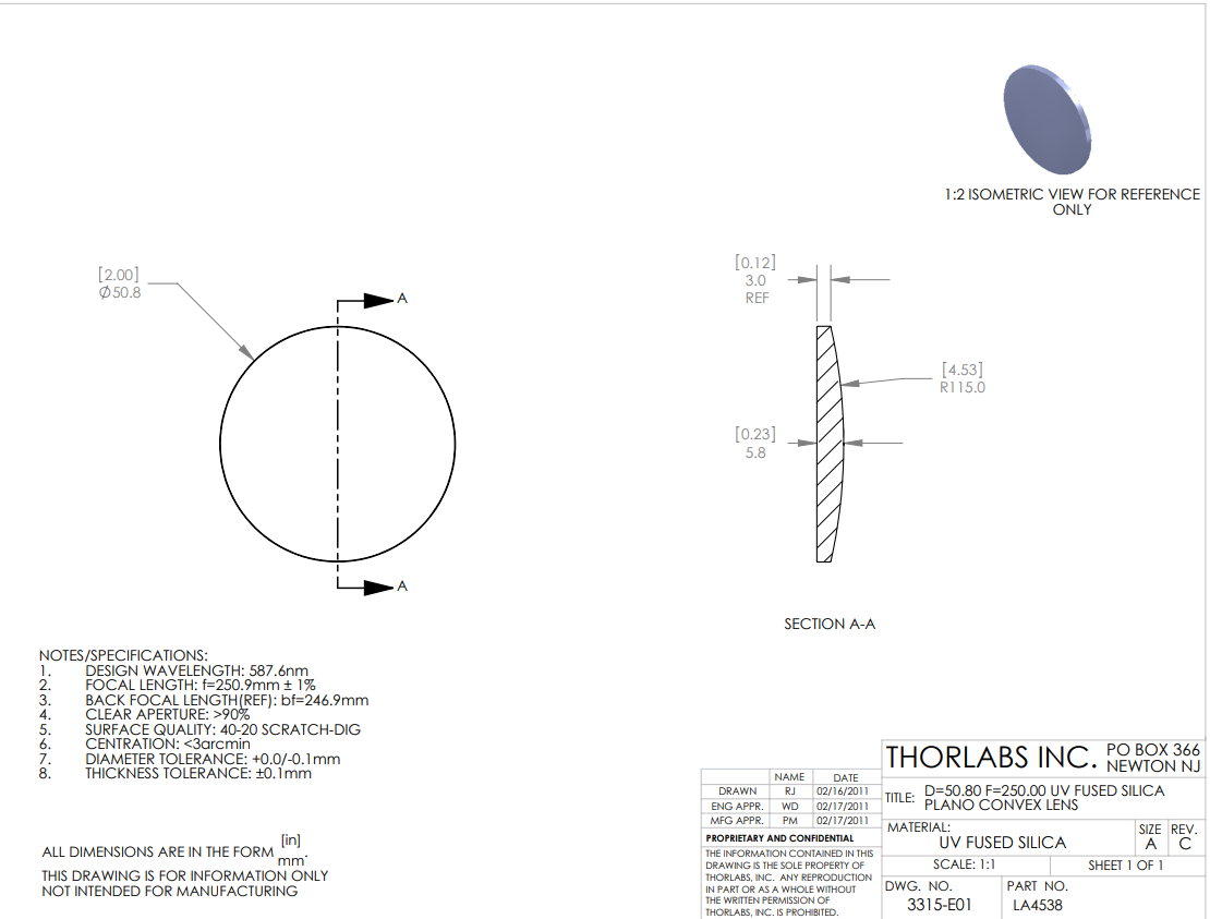 Thorlabs索雷博 LA4538 平凸透镜