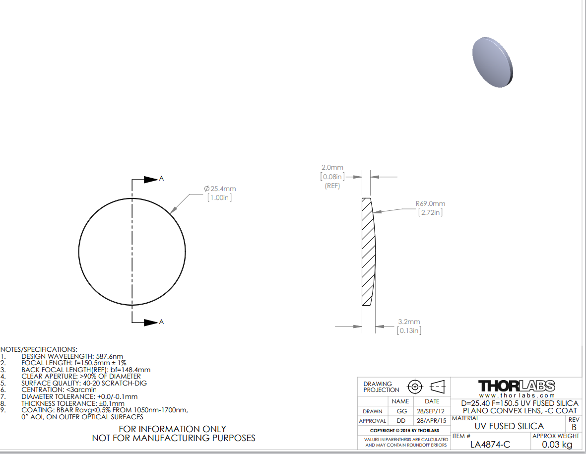 Thorlabs索雷博 LA4874-C 紫外熔融石英平凸球透镜