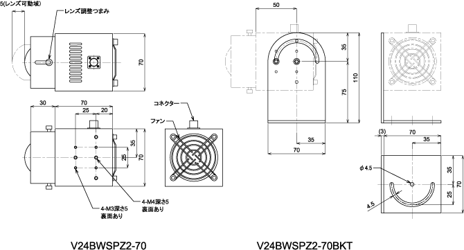 照明器冷却风扇 连接专用电缆 V24TA5F-○M | 电缆长度 | 1~5m | 电缆类型 | 机器人电缆AWG22(4芯,外径4.7mm) | 连接器 | 照明器侧 ER03-PB5F(多治见无线电机制造)、 电源侧 照明器连接 SMR-03-B(NipponPressure 制造)、风扇 SMR-04-B(NipponPressure 制造) | 电源侧极性 | 用于照明器连接的引脚 1 :+(粉色芯线) 引脚 2:NC 引脚 3:-(蓝色芯线) 用于风扇连接的引脚1 :NC 引脚 2:+(橙色芯线) 引脚 3:NC 引脚 4:-(绿芯线)) |