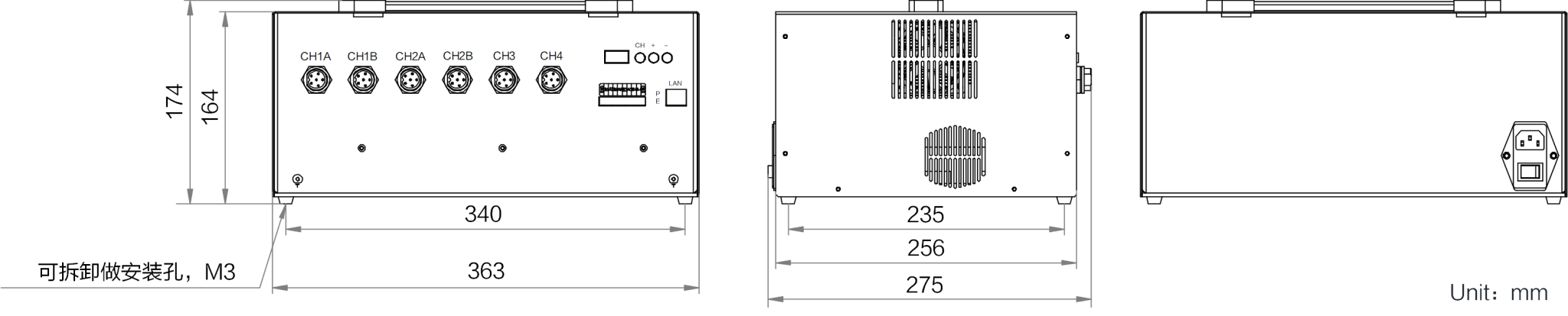 名称 | 频闪线光源控制器,总输出功率2400W/48V,4通道(CH1/2为双接口、CH3/4为单接口),单通道最高20A,19M-6G接头(适配19M-6H接头光源),4路外触发输入(RS422差分),带网口,最大频率100kHz,分时相机专用。 |