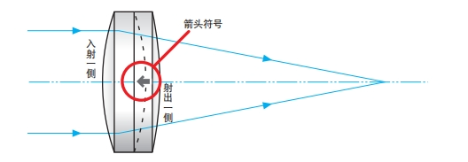▶入射消色差透镜的平行光有方向性,要从曲率半径较小的一侧(有箭头符号指向的一面)射入平行光。从相反的一侧射入平行光时,会产生色差或球差,焦点光斑会变大。