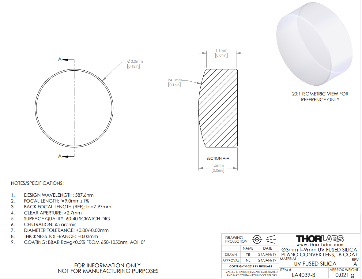 Thorlabs索雷博 LA4039-B 紫外熔融石英平凸球透镜