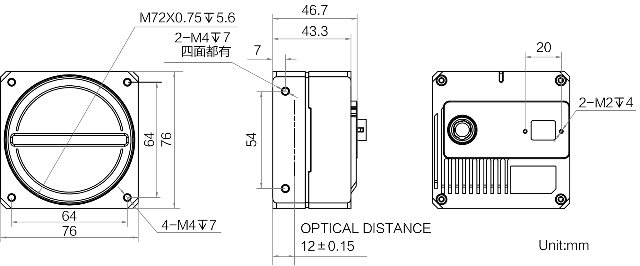 结构 | 镜头接口 | M72*0.75,法兰后焦12 mm;可通过转接环转接至F口、C口及其他螺纹口镜头 |