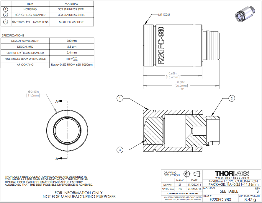 Thorlabs索雷博 F220FC-980 光纤准直器