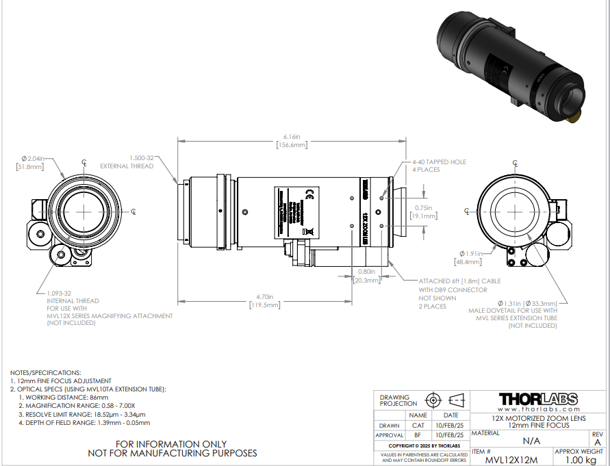 Thorlabs索雷博 MVL12X12M 12X变焦镜头