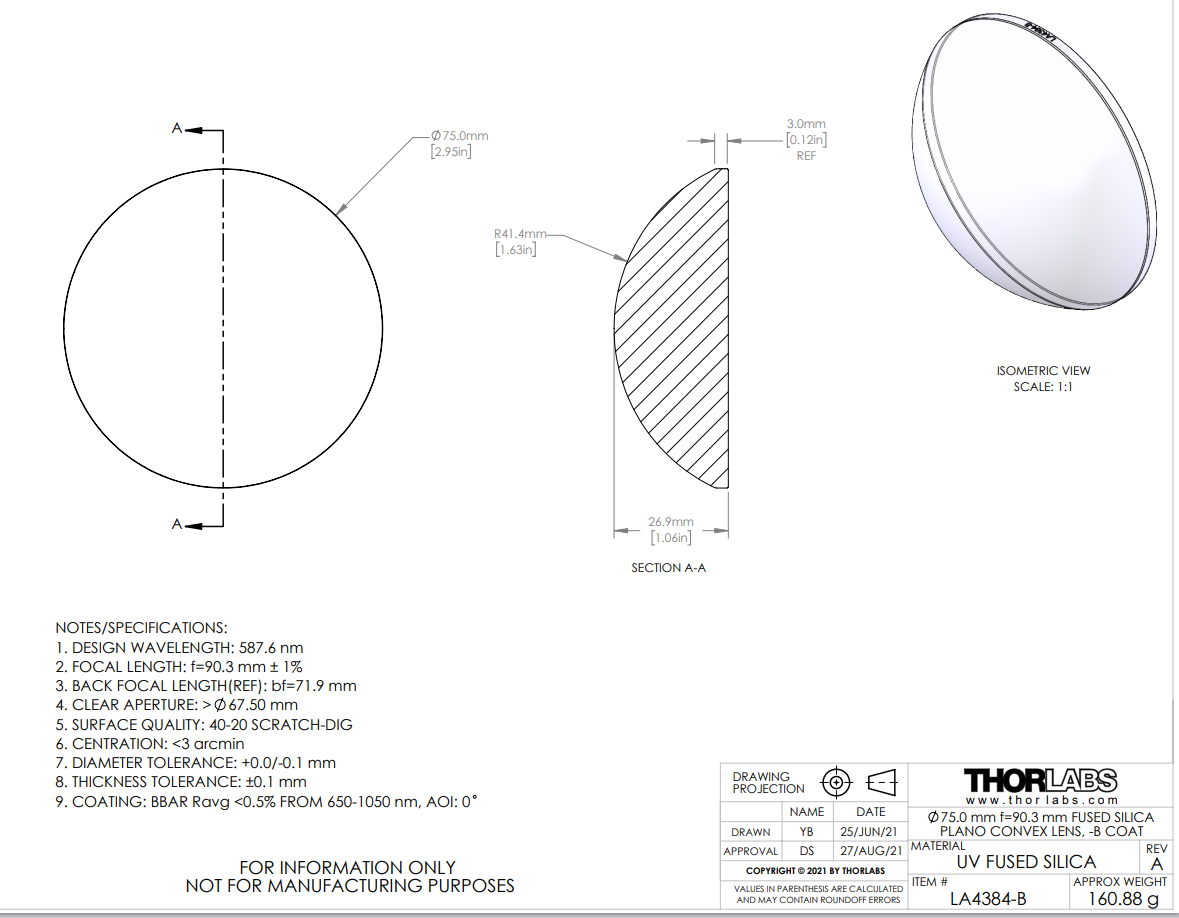 Thorlabs索雷博 LA4384-B 紫外熔融石英平凸球透镜