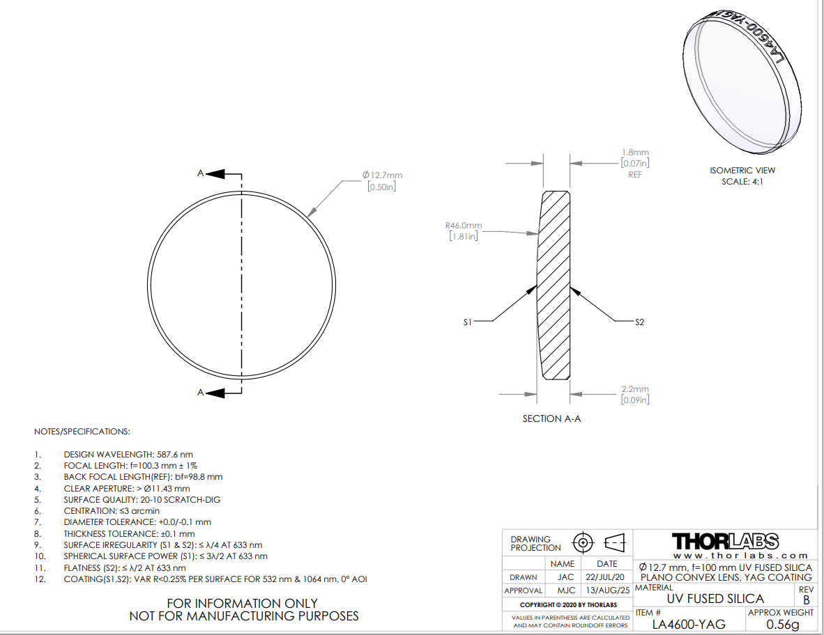 Thorlabs索雷博 LA4600-YAG 紫外熔融石英平凸球透镜