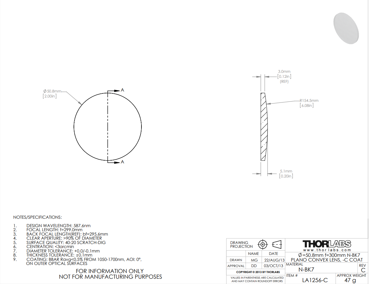 Thorlabs索雷博 LA1256-C 平凸透镜