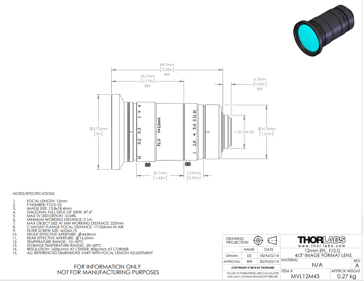 - MVL12M43兼容我们的科研级相机,但是与密封相机一起使用时,可能需要移除相机附带的红外滤光片。关于兼容性和推荐用途的相关问题,请联系技术支持。