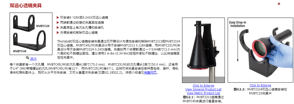 Thorlabs索雷博 MVBTC25/M 双远心透镜夹具