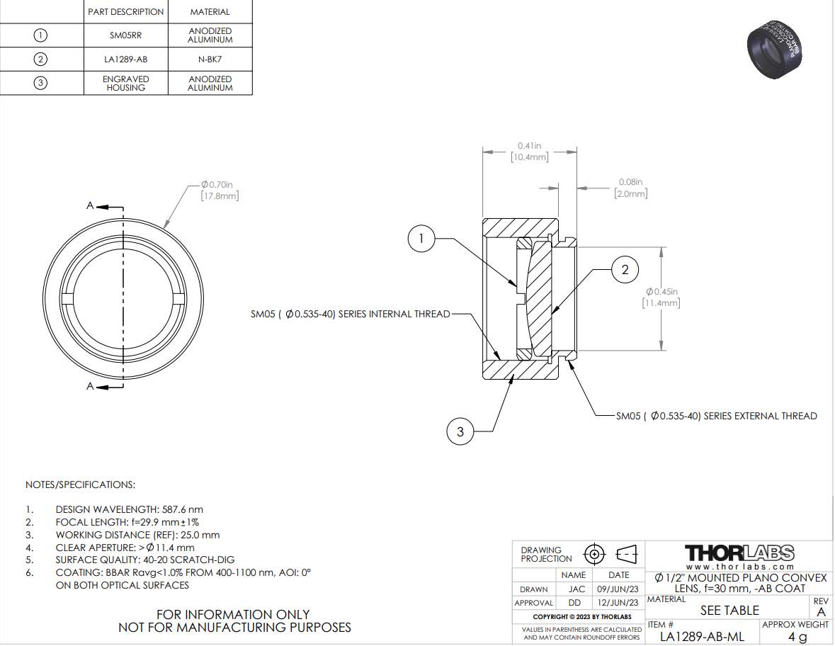 这些平凸透镜由符合RoHS标准的N-BK7材料制成,且镀有增透(AR)膜,在400 nm - 1100 nm波长范围内提供每个表面< 1.0%的平均反射率。N-BK7通常用于不需要紫外熔融石英的高级性能(如在紫外波段的高透过率和较低的热膨胀系数)的应用场合。这些Ø1/2英寸、Ø1英寸、Ø1.5英寸和Ø2英寸的透镜分别安装在兼容SM05(0.535"-40)、SM1(1.035"-40)、SM1.5 (1.535"-40)和SM2(2.035"-40)螺纹的安装座中,从而兼容我们的SM螺纹透镜套筒。SM螺纹卡环用于将透镜固定在安装座中。每个安装座都刻有产品型号、透镜类型、焦距、指向透镜曲面的箭头以及增透膜范围。