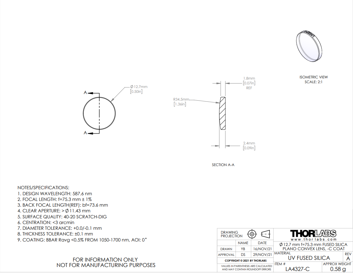 其中,n是折射率,R是透镜表面的曲率半径。这些透镜由阿贝数为67.82的紫外级熔融石英制成;阿贝数是色散指标。