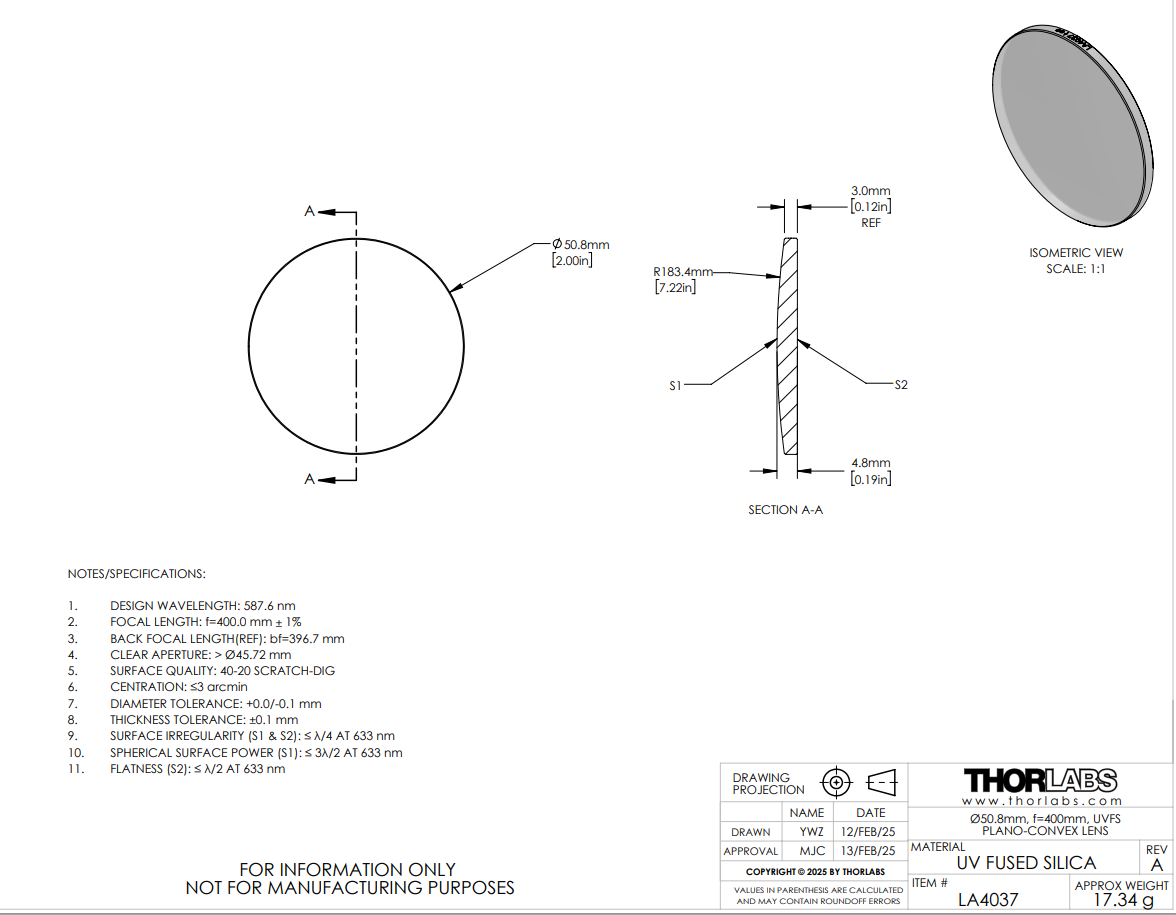 其中,n是折射率,R是透镜表面的曲率半径。这些透镜由阿贝数为67.82的紫外级熔融石英制成;阿贝数是色散指标。