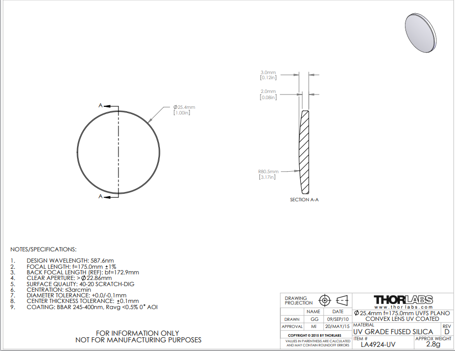 Thorlabs索雷博 LA4924-UV 平凸透镜