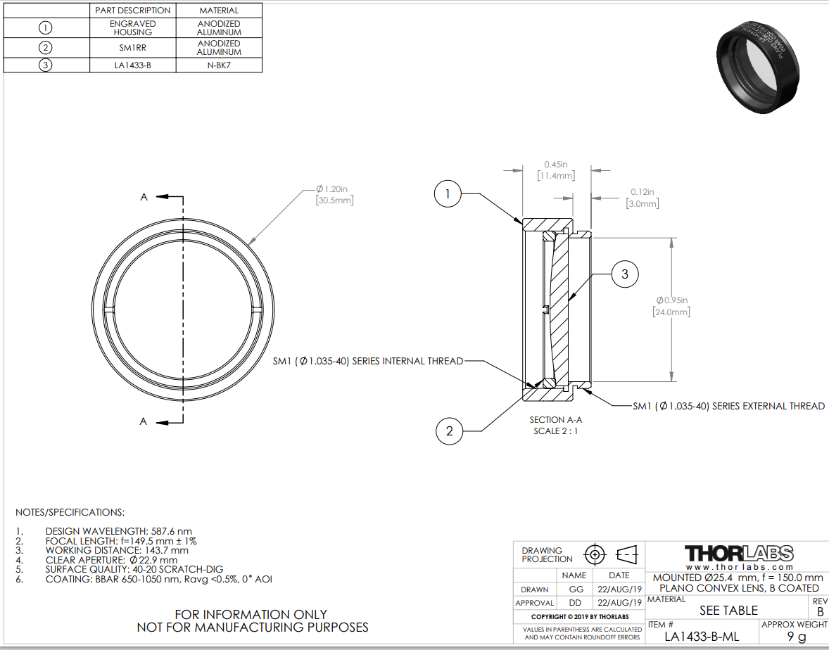 这些平凸透镜由N-BK7材料制造,它是符合RoHS标准的BK7玻璃,并且镀有增透膜,在650 - 1050 nm波长范围上提供每个表面< 0.5%的平均反射率。N-BK7是制造高性能光学元件最广泛使用的光学玻璃之一。当紫外熔融石英的额外好处(即良好的紫外透过率和较低的热膨胀系数)不那么必要时,通常会选择该材料。这些Ø1/2英寸,Ø1英寸、Ø1.5英寸和Ø2英寸的透镜分别安装在兼容SM05 -(0.535"-40),SM1-(1.035"-40)、SM1.5(1.535"-40)和SM2-(2.035"-40)螺纹的安装座上,从而兼容我们的SM螺纹透镜套管。每个透镜套筒都刻有型号,透镜类型,焦距和指向透镜弯曲表面的箭头,以及增透膜范围。