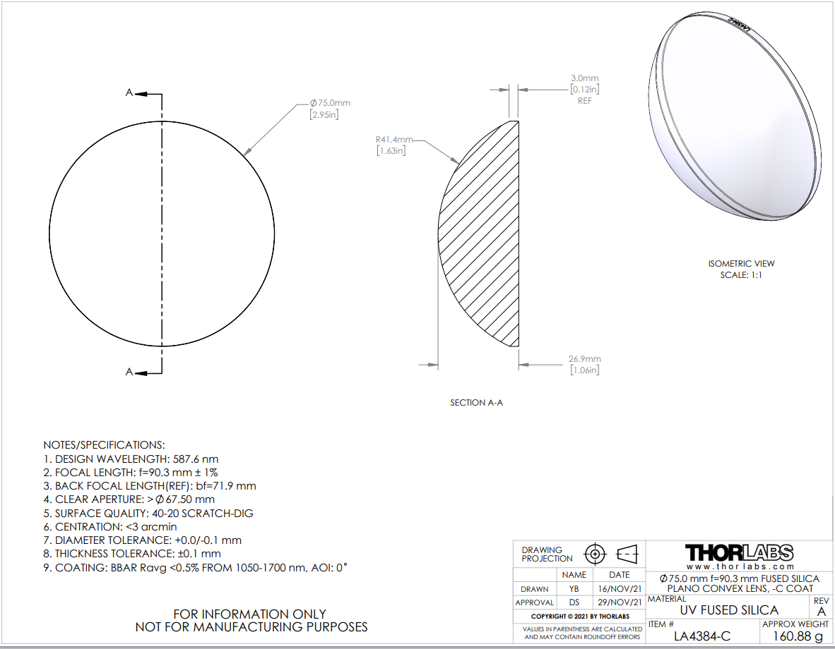 Thorlabs索雷博 LA4384-C 紫外熔融石英平凸球透镜