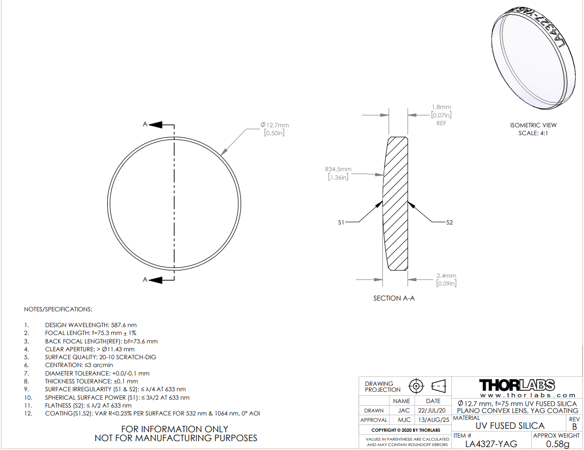 Thorlabs索雷博 LA4327-YAG 紫外熔融石英平凸球透镜