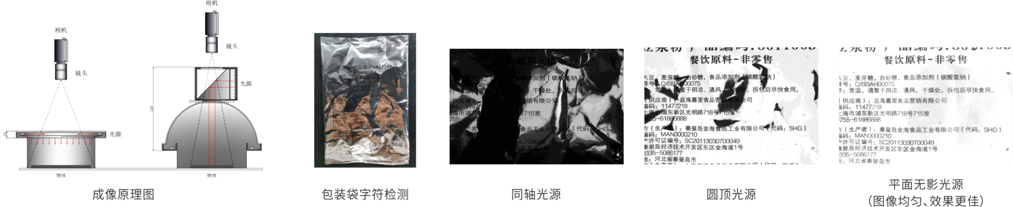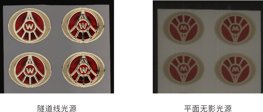 不同光源成像对比(平面无影光源可用于线扫使用,获得更均匀的效果)
