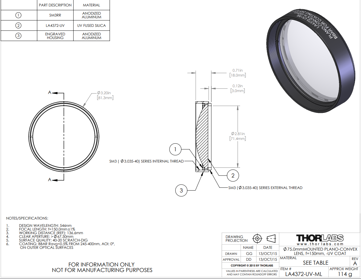 透镜直径 | Ø1/2" 螺纹安装座(SM05螺纹规格) (0.535"-40) SM1-螺纹接口中的"Ø1" (1.035"-40) SM2螺纹安装中的Ø2 (2.035"-40) Ø75毫米 SM3螺纹接口 (3.035"-40) |