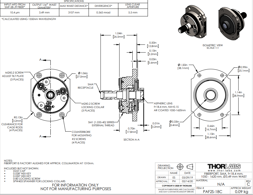 | PAF2S-18C | 18.4 mm | 10.4 µm | 3.49 mm | 3107 mm | 0.565 mrad | 5.5 mm | 0.15 | 1050 - 1620 nm | D-ZK3 | 1.04" (26.5 mm) |