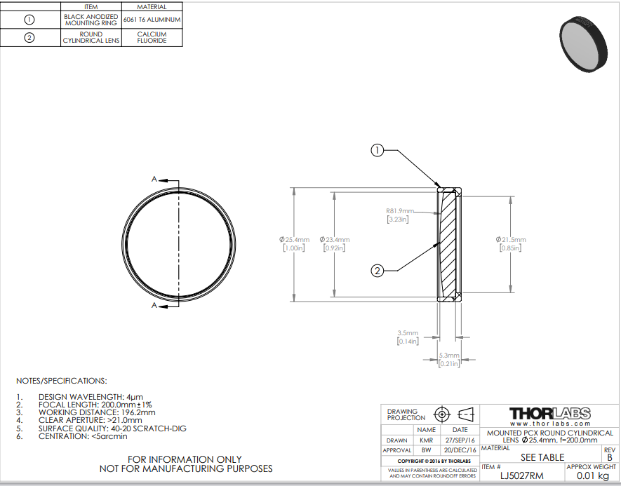不同于典型的长方形外壳安装的柱透镜,这类柱透镜封装在圆形黑色阳极氧化铝外壳中,见页面上方的图示。每个外壳都刻有产品编号和焦距;外壳可以通过卡环固定到光学元件安装座和旋转安装座,以及Ø1/2英寸或Ø1英寸透镜套筒。因为他们只能在一维聚焦光线,所以组成一对能够变形图像或者校正散光。这个属性在中红外量子级联激光器和间带级联激光器中尤其有用,因为它们输出光线在纵轴上有非常不同发散角。