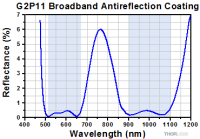 图G3.1:G2P11透镜镀增透膜的反射率。蓝色阴影区域表示最优性能的指定波长范围。