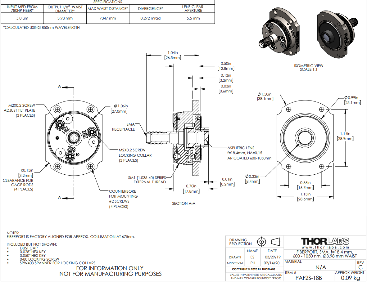 Thorlabs索雷博 PAF2S-18B 带非球面透镜