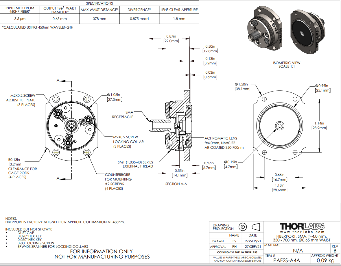 Thorlabs索雷博 PAF2S-A4A 带消色差透镜