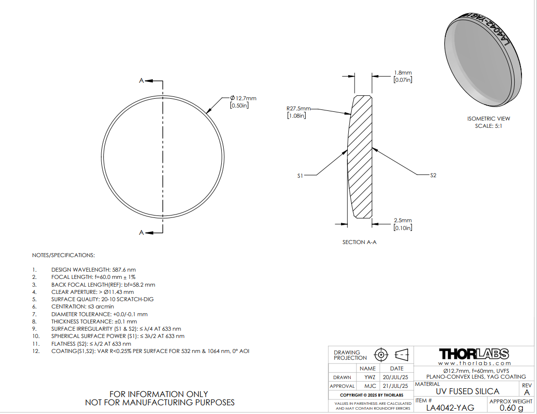 Thorlabs索雷博 LA4042-YAG 紫外熔融石英平凸球透镜
